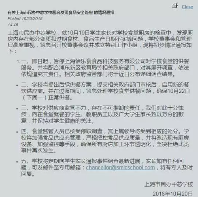 10月19日晚,位于張江的上海中芯國際學校青桐校區食堂經舉報存在蔬菜發霉、廚房環境臟亂等食品安全問題,引發社會關注。
