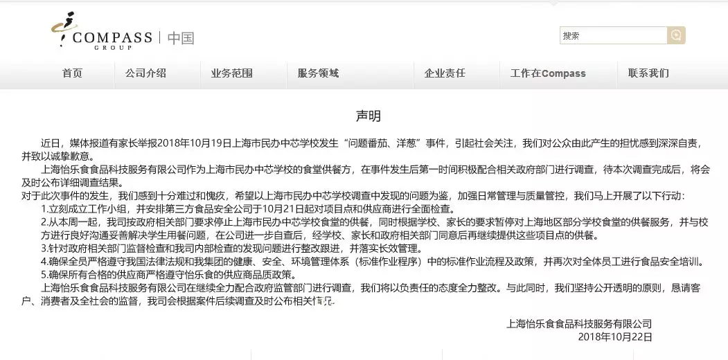 根據學校的通報情況,該食堂的供應商是上海怡樂食食品科技服務有限公司,由康帕斯(compass)百分百占股,已經為中芯國際學校服務四年。