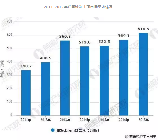 我國速凍面米產(chǎn)量由2005年129萬噸擴增至2014年528萬噸,年均復合增速為16.96%,其中2013年速凍面米制品行業(yè)的產(chǎn)值約為400億元。預(yù)計中國速凍面米制品行業(yè)未來5年產(chǎn)銷量年均復合增長將達到13%-17%,發(fā)展勢頭較為迅猛。 2017年我國速凍面米食品行業(yè)需求量約618.5萬噸,同比2016年的569.1萬噸增長了8.68%。