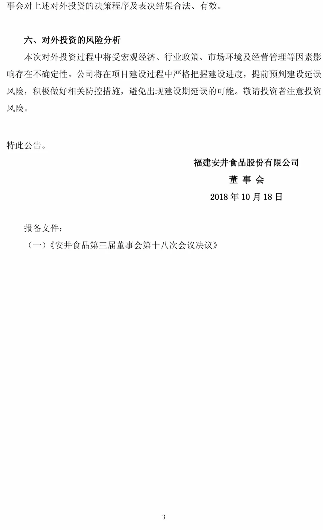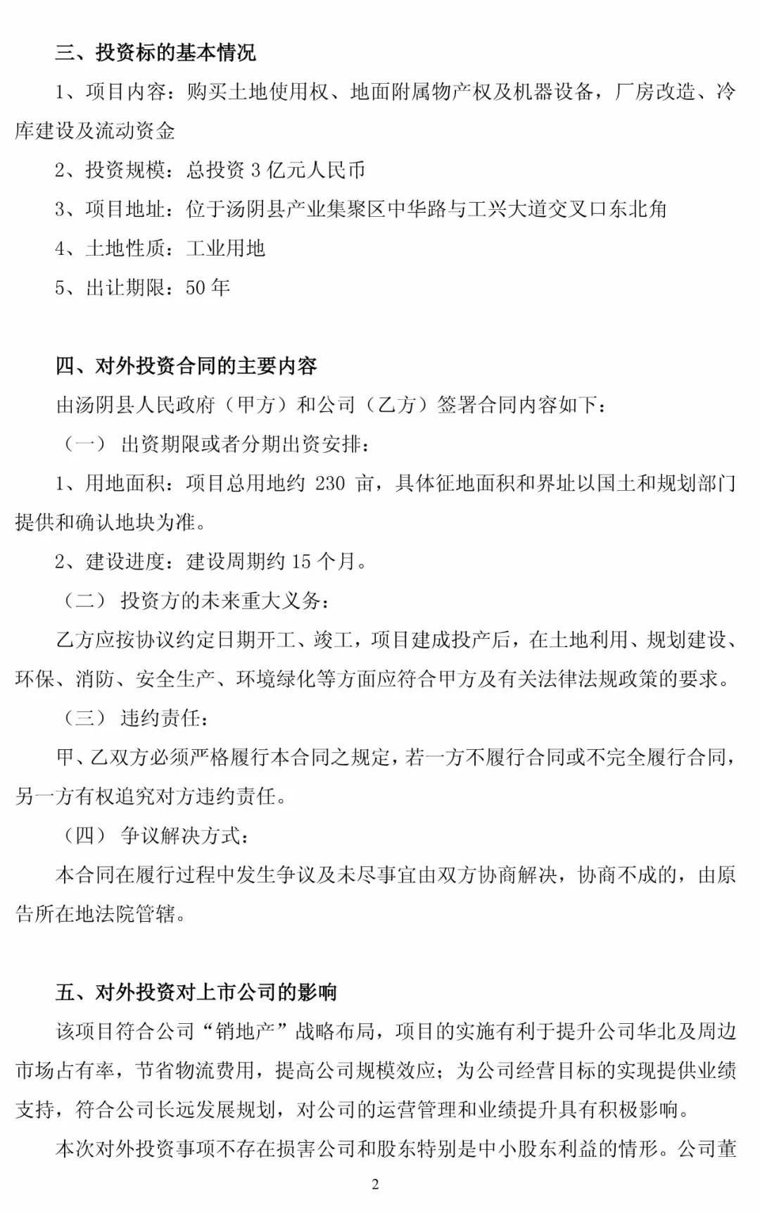 10月17日,安井食品召開第三屆董事會(huì)第十八次會(huì)議,審議通過(guò)了《關(guān)于公司對(duì)外投資建設(shè)華北生產(chǎn)基地項(xiàng)目的議案》,同意公司以3億元人民幣投資該項(xiàng)目。同日,公司與湯陰縣人民政府簽署《安井食品華北基地項(xiàng)目投資合同》。