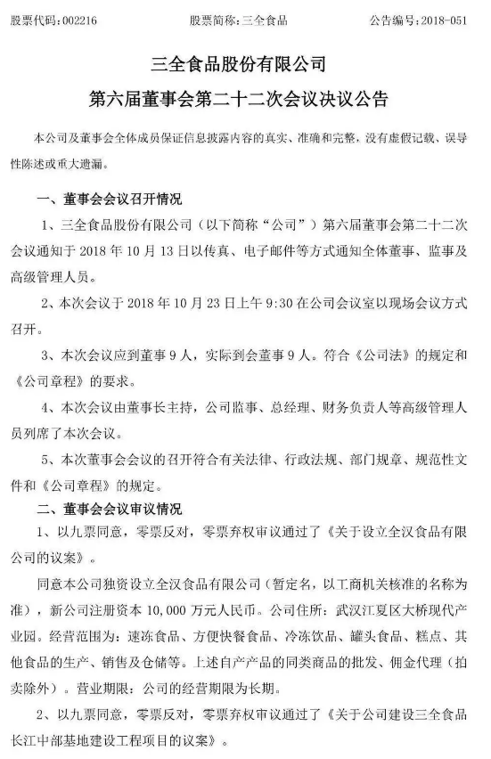 三全食品公告透露,選擇在武漢建廠,是為了靠近消費市場。